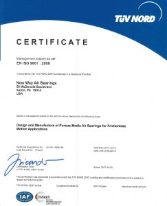 On September 2, 2018, New Way® Air Bearings, the world’s largest independent manufacturer of porous media air bearing products, achieved ISO 9001:2015 certification, the latest ISO standard designation. New Way received its certificate from the same independent auditing firm that evaluated New Way when it achieved its original ISO 9001:2000 Certification back in November, 2008. This further demonstrates the organization’s commitment to quality-of-service standards established by the International Organization for Standardization (ISO).
