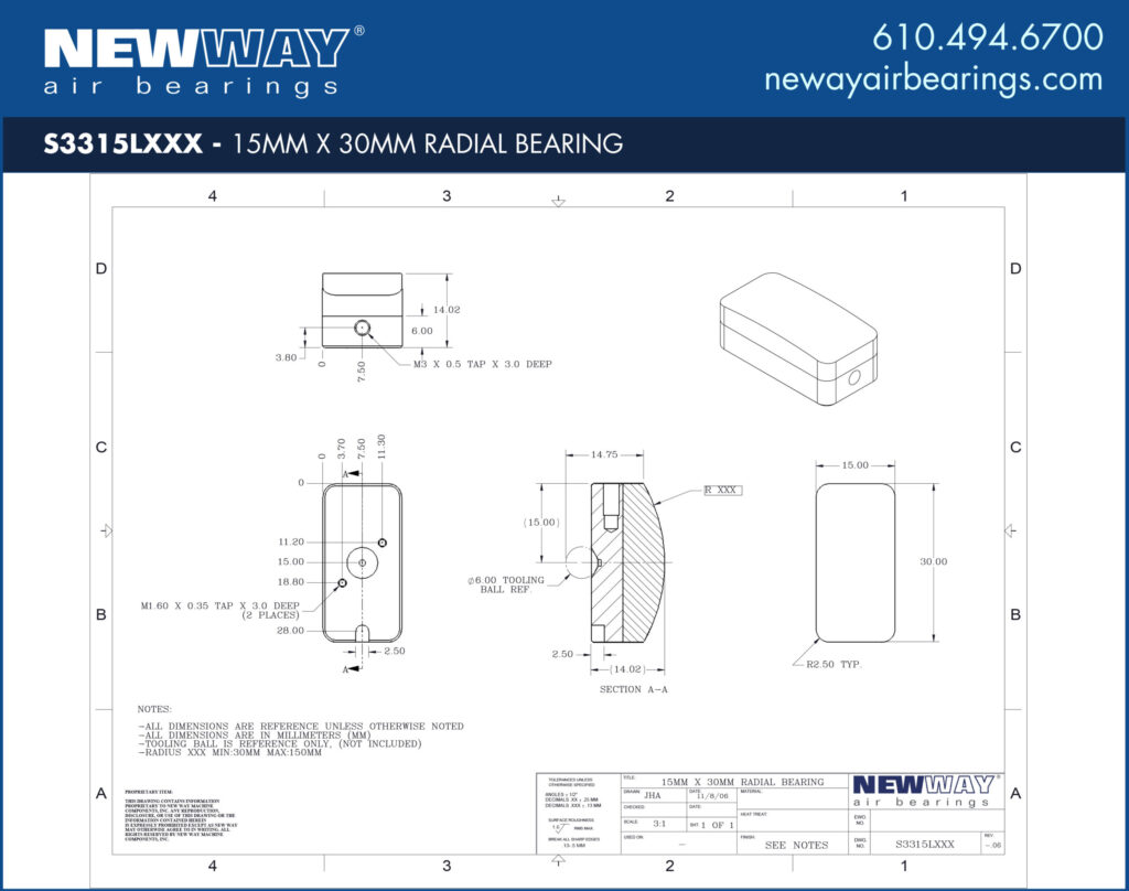 Second-smallest of the New Way Convex Radial Air Bearing product line, the 15mm x 30mm size provides load-carrying capability with the flexibility to fit into the tightest designs. For rotary or linear motion, these radial air bearings compare favorably with conventional rolling element bearings across virtually every performance characteristic. They are also easy to apply, maintain, and change.