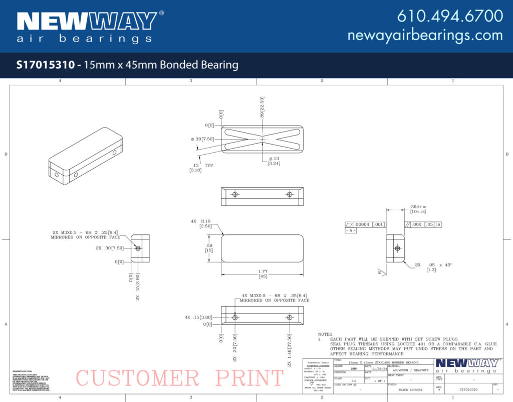 New Way’s 15mm x 45mm Bonded Bearing offers a solution for space-constrained linear applications. Bonded bearings are a low-profile version of our flat rectangular bearings as well as a critical component of our popular Linear Slides. Sold as a standalone component, bonded bearings are able to be positioned accurately through the use of vacuum replication prior to bonding the bearing into place.