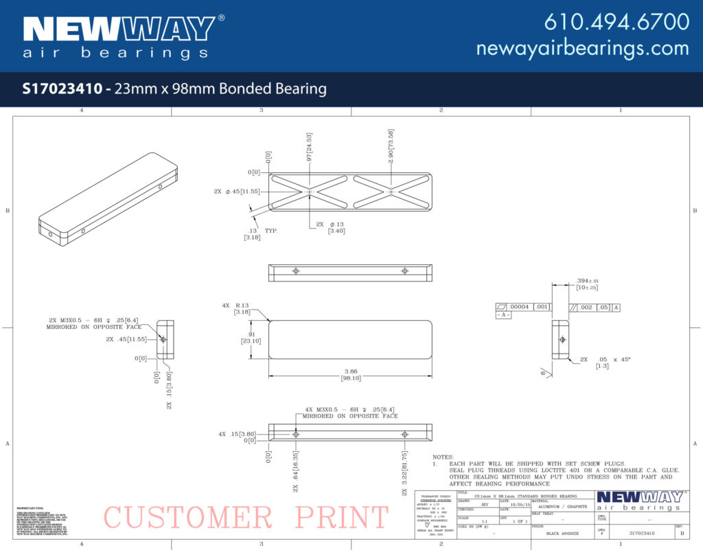 New Way’s 23mm x 98mm Bonded Bearing offers a solution for space-constrained linear applications. Bonded bearings are a low-profile version of our flat rectangular bearings as well as a critical component of our popular Linear Slides. Sold as a standalone component, bonded bearings are able to be positioned accurately through the use of vacuum replication prior to bonding the bearing into place. The large length size relative to the width is accommodated through an additional set of air grooves to ensure even distribution of air for optimum performance.