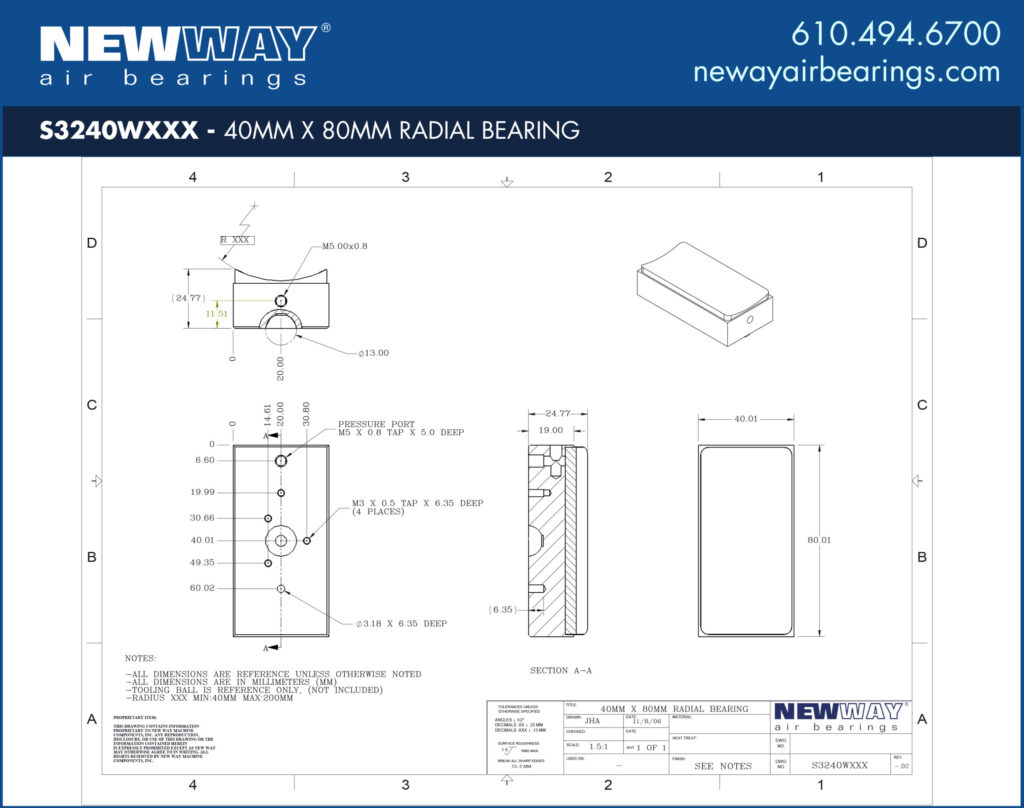 Fifth-smallest of the New Way Concave Radial Air Bearing product line, the 40mm x 80mm size provides a good balance of scale and load-carrying capability. For rotary or linear motion, these radial air bearings compare favorably with conventional rolling element bearings across virtually every performance characteristic. They are also easy to apply, maintain, and change.