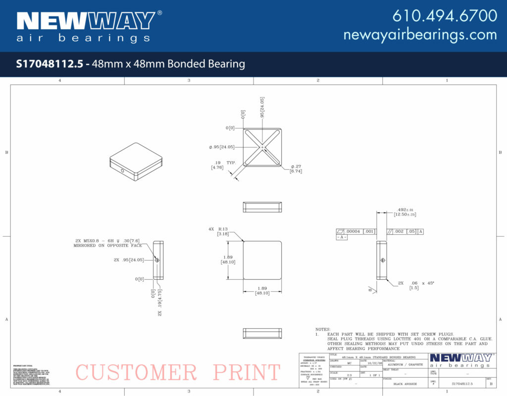 New Way’s 48mm x 48mm Bonded Bearing offers a solution for space-constrained linear applications. Bonded bearings are a low-profile version of our flat rectangular bearings as well as a critical component of our popular Linear Slides. Sold as a standalone component, bonded bearings are able to be positioned accurately through the use of vacuum replication prior to bonding the bearing into place. Contact us today at 610.494.6700 for more information on using bonded bearings in your application!