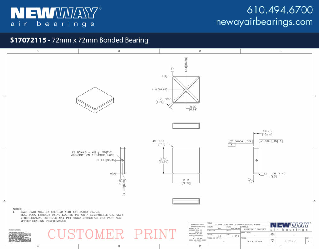 New Way’s 72mm x 72mm Bonded Bearing offers a solution for space-constrained linear applications. Bonded bearings are a low-profile version of our flat rectangular bearings as well as a critical component of our popular Linear Slides. Sold as a standalone component, bonded bearings are able to be positioned accurately through the use of vacuum replication prior to bonding the bearing into place.