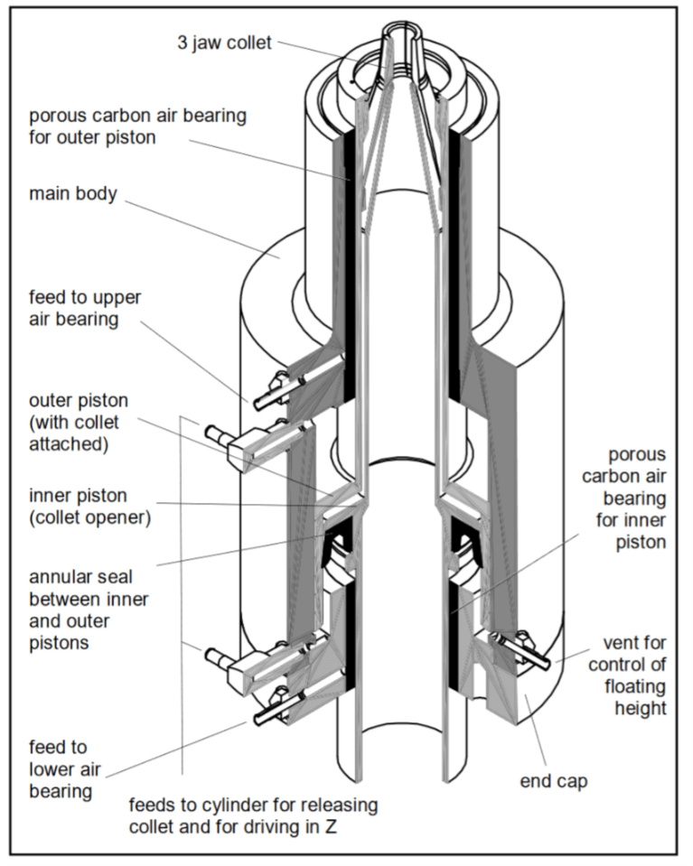 “We can’t necessarily expect that from every supplier,” commented Gillingham. The robot design was more straightforward as it was able to accommodate the use of standard New Way flat round air bearings and air bushings.