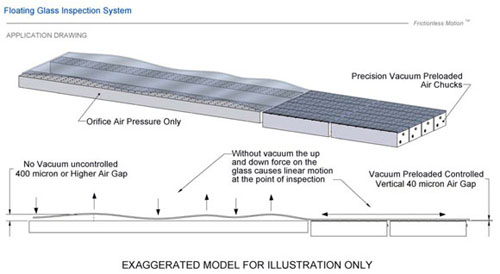 The precision chucks used employ a slightly higher vacuum pressure (-2.50 to -10.00 kPa as compared with -0.25 to -1.00 kPa used in similar conveyors). The vacuum is projected across a narrower/smaller area as the glass is stiff locally. The vacuum holes are engineered so that they match the flow through the porous media. In this way, the flow through a vacuum hole remains the same whether there is glass over it or not, so there is no change in restriction or flow, and so no change in pressure or fly height.