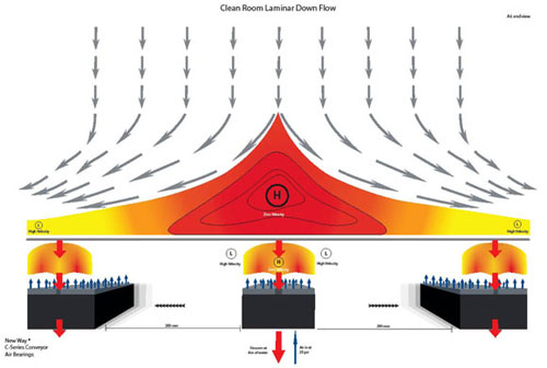 Ambient grooves in the plate, under the floating glass, are one method used to minimize the development of pressure differentials. Another method uses hollow aluminum bars as a platform, rather than a single large plate. These bars introduce air pressure beneath the floating glass through small holes drilled at regular intervals. The spaces between the bars avoid a pressure gradient build-up. But there is still high pressure above the glass created by the cleanroom down draft. This force can amount to a multiple of the weight of the glass, increasing sag between the conveyors. The air flow counteracting this force will have a high pressure point in the center of each aluminum bar. This point acts as a fulcrum for the glass, which will sag from this point to its lowest point, directly between the conveyors. Because FPD glass is not very stiff, this sag can be surprising – even disastrous – if the glass feeds onto a perpendicular surface.
