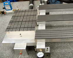 New Way Air Bearings showed three modular air bearing products designed to meet non-contact glass-handling requirements for manufacturing. The differentiated technical approach relies on porous carbon. The porous-carroach controls the airflow across the entire bearing surface through millions of holes in the porous material. New Way Air Bearings has found porous carbon to be one of the best materials for this purpose, producing an ideal supply of uniform air pressure across the face of the bearing while automatically restricting and damping the air flow at the same time. The carbon surface (Fig. 1) provides greater bearing protection in the event of an air-supply failure and allows the bearings to be moved during air failure without damaging the support surface.